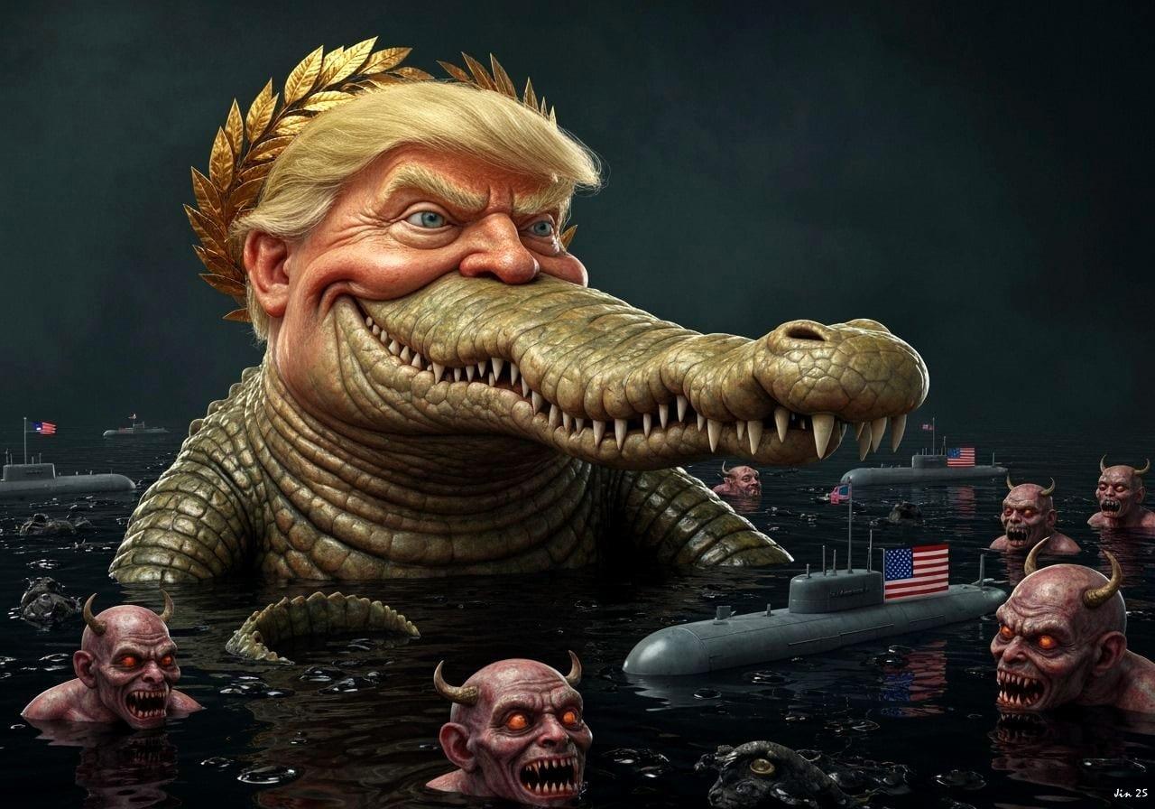 The #Trumpigula crocodile empire runs on stolen oil & genocide. Boycott the Unstable Slavers today & every day till it falls. #USFascism #ImpeachTrump #AIillustrations #StopAUKUS