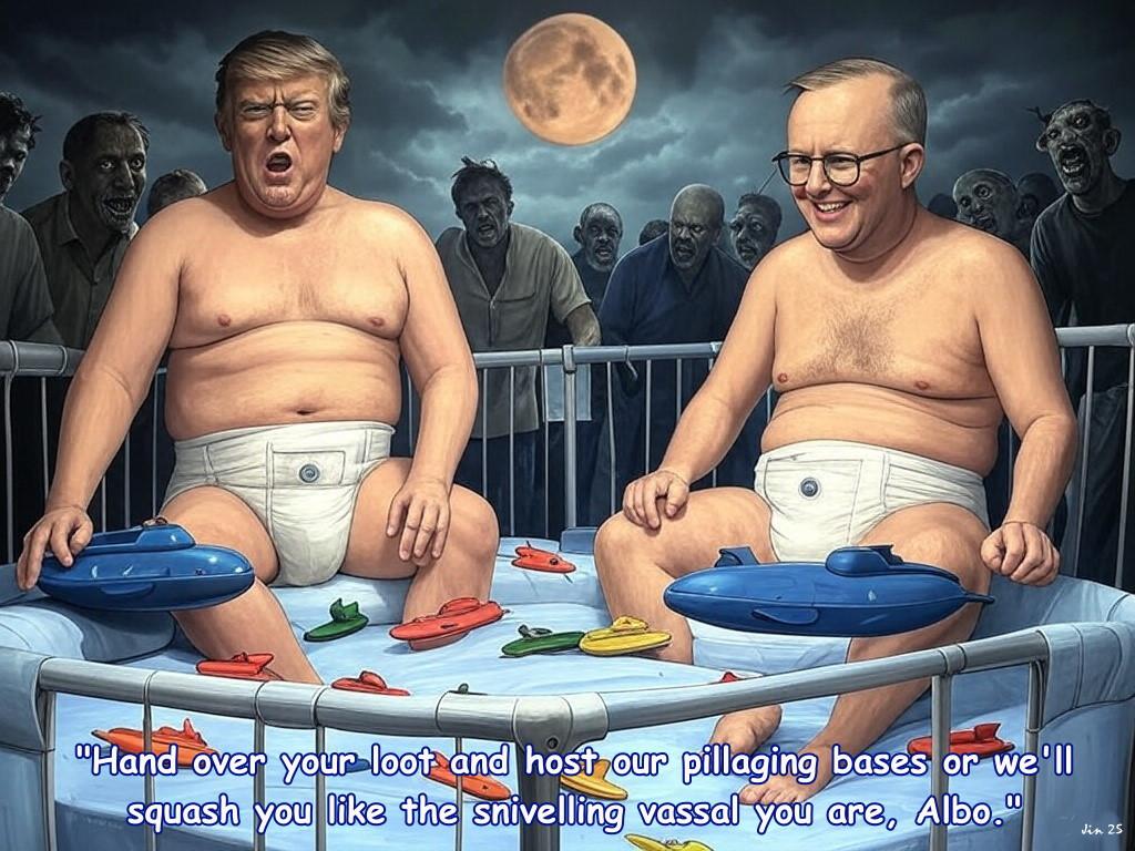 Why chain Australia to the war-mongering, planet-destroying Unstable Slavers MIC mobsters, Albo, putting us in hock to the ravenous Beast? #StopAUKUS #auspol #AIart #AIcartoons