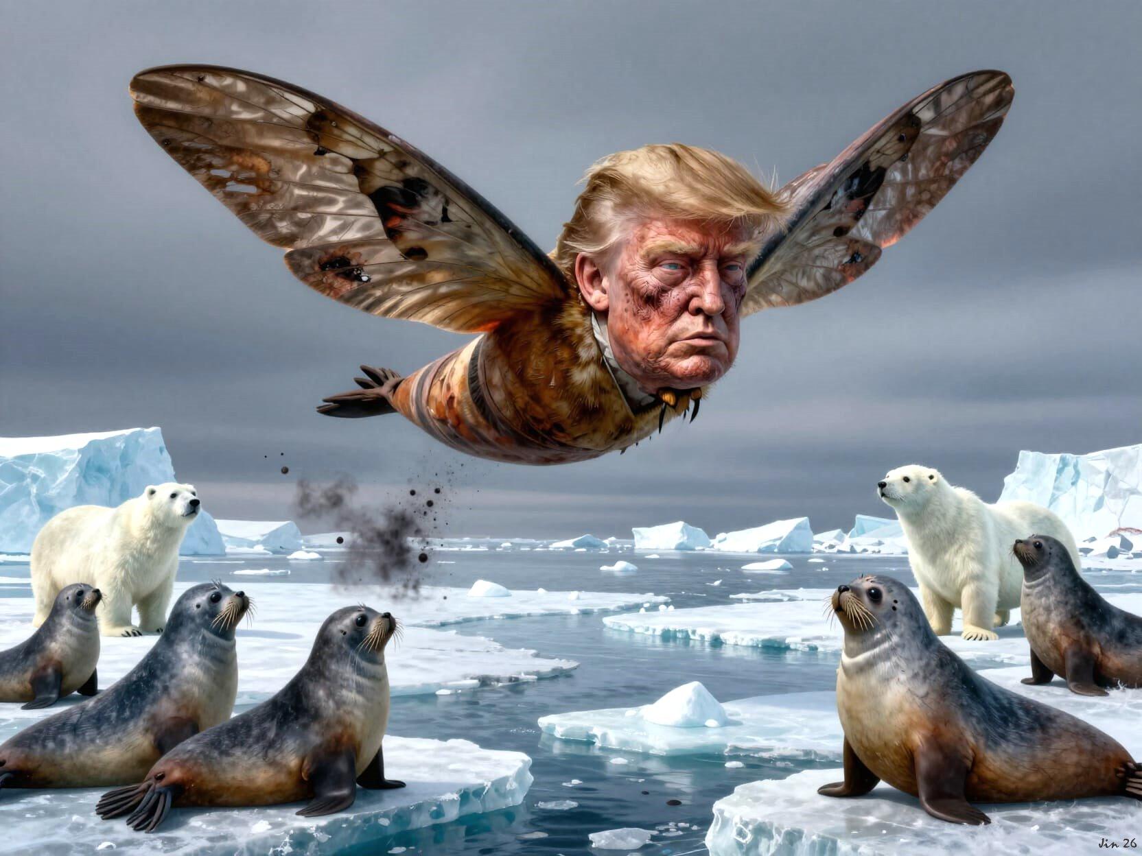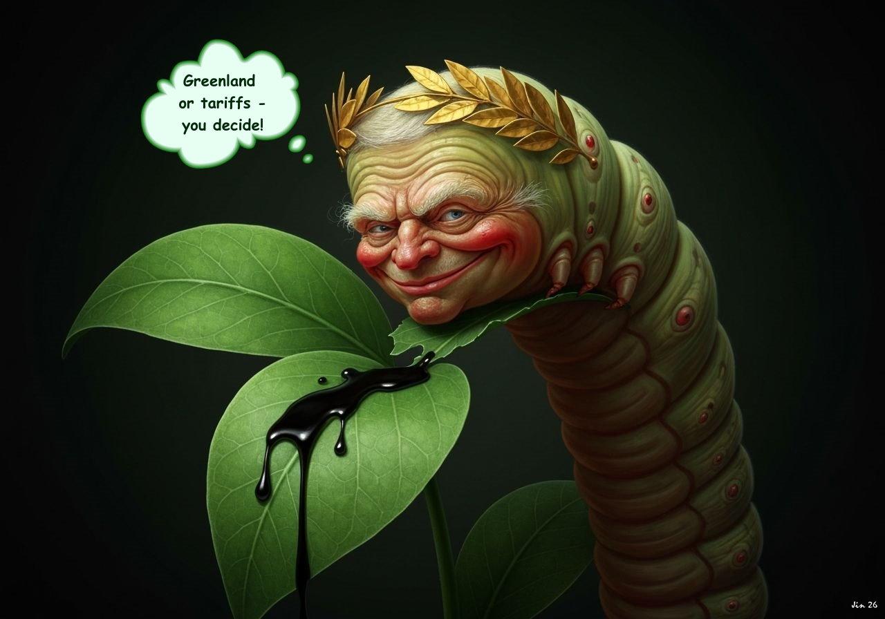 Today's cartoon ... another from my hungry caterpillar series, as the gobbling #Trumpigula threatens the Euros in his sleazy attempt to steal Greenland. Is this any way to treat your friends? https://time.com/7346949/trump-greenland-tariffs-threat/ #USFascism #AIart #cartoons