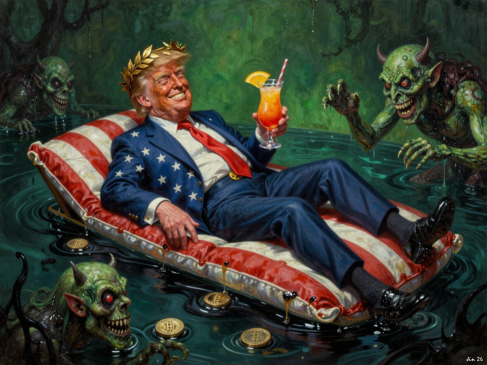 The Donroe Doctrine - #Trumpigula parties with billionaire demons in a swimming pool of stolen oil. #ImpeachTrump #USFascism #Venezuela #AIillustration